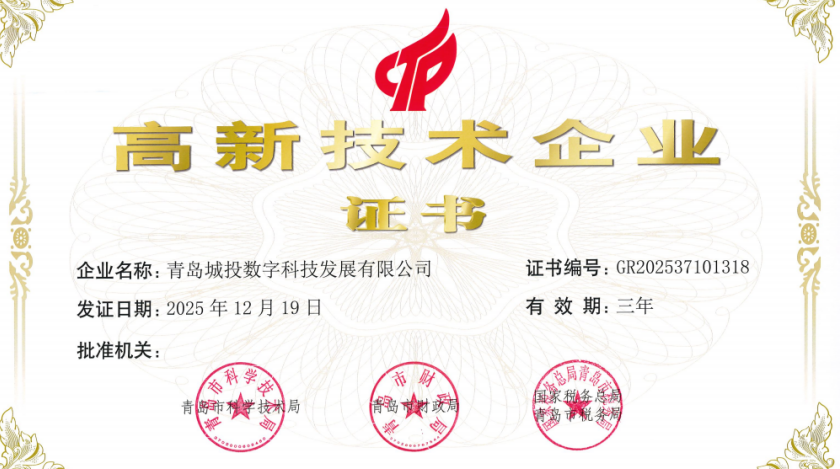 青岛城投数科公司获得市“高新技术企业”认定