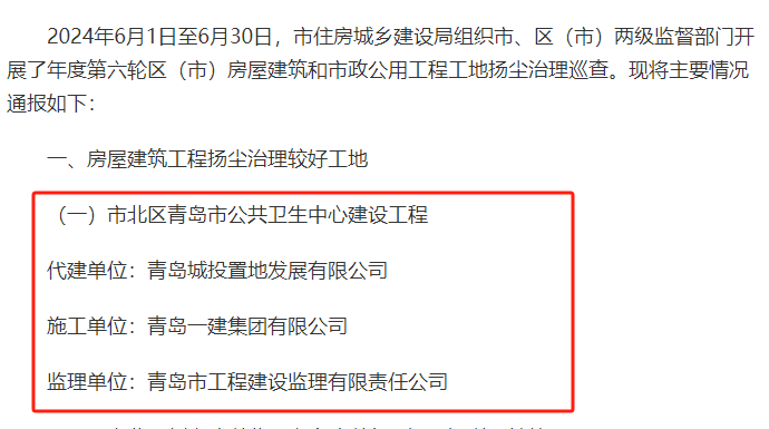 近日,青岛城投集团旗下城市更新集团公共卫生中心项目积极响应市住建局号召,做好项目扬尘治理,并在青岛市住建局2024年第六轮房屋建筑和公用工程工地扬尘治理检查中获通报表扬。(图为住建局网站公示)建筑工地扬尘污染防治是改善居住环境的重大举措,是加强生态文明建设、促进城市科学发展的根本需求,公共卫生中心项目位于我市中心地带,防尘任务更加艰巨迫切。该项目投资估算9.8亿元,土地性质为医疗卫生用地(A5),占地