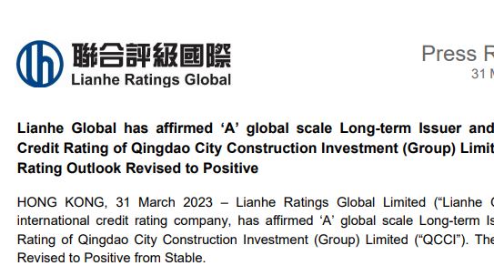 近日,联合评级国际正式确认给予青岛城投集团“A”境外主体评级,展望从稳定调整至正面。联合国际认为,城投集团在青岛市城市更新、招商引资等整体区域发展中发挥着极其重要的战略性作用。(图为联合评级国际官网新闻稿)作为市场占有率最高的中资境外评级机构,联合国际在国际资本市场拥有较高的公信力。本次展望调整充分体现了城投集团与青岛政府紧密的关系及在青岛市整体发展建设中的日益增强的战略性作用得到了境内外资本市场
