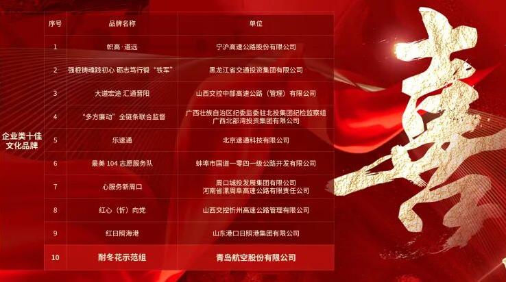 喜报!青岛航空荣获第七届交通运输优秀文化品牌“十佳”称号